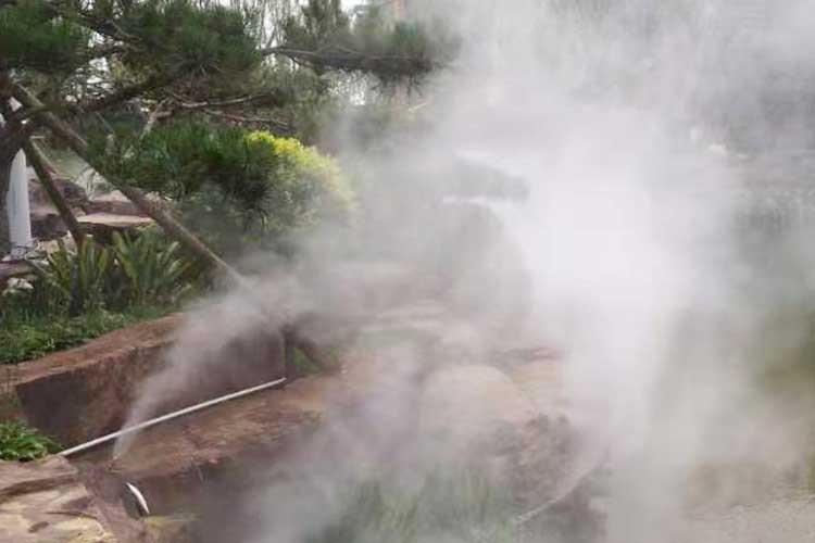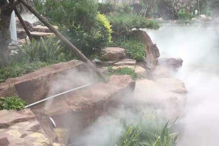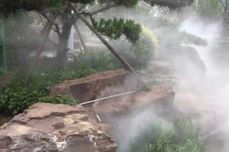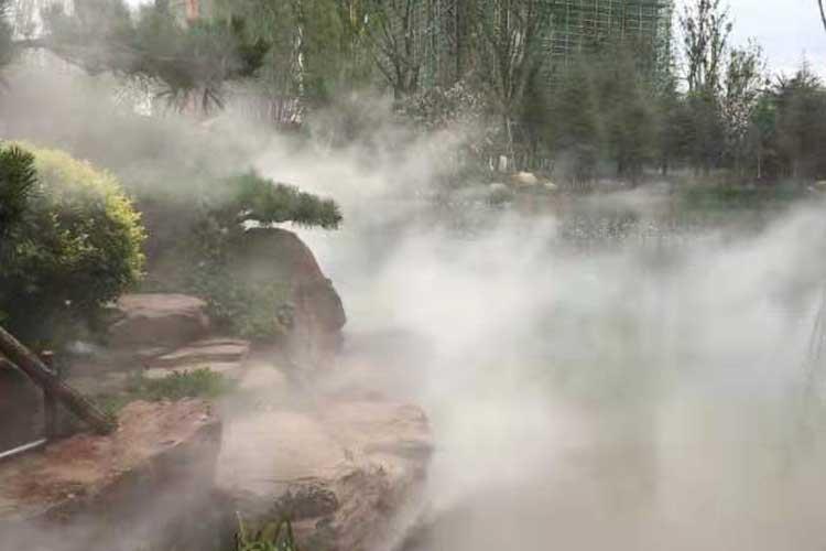 人工造霧是利用專用造霧主機將經過過濾處理的水,輸送到造霧專用高壓管網(耐壓14MPa),使常溫的水變成極細小的水 粒,在空氣中彌漫,形成白色云霧,到達造霧專用噴頭噴出成霧。人工造霧以改善空氣質量,優化環境為依托,以景觀、保濕、 防塵、降溫、造景為目的,在自然園林、環境景觀方面應用廣泛。